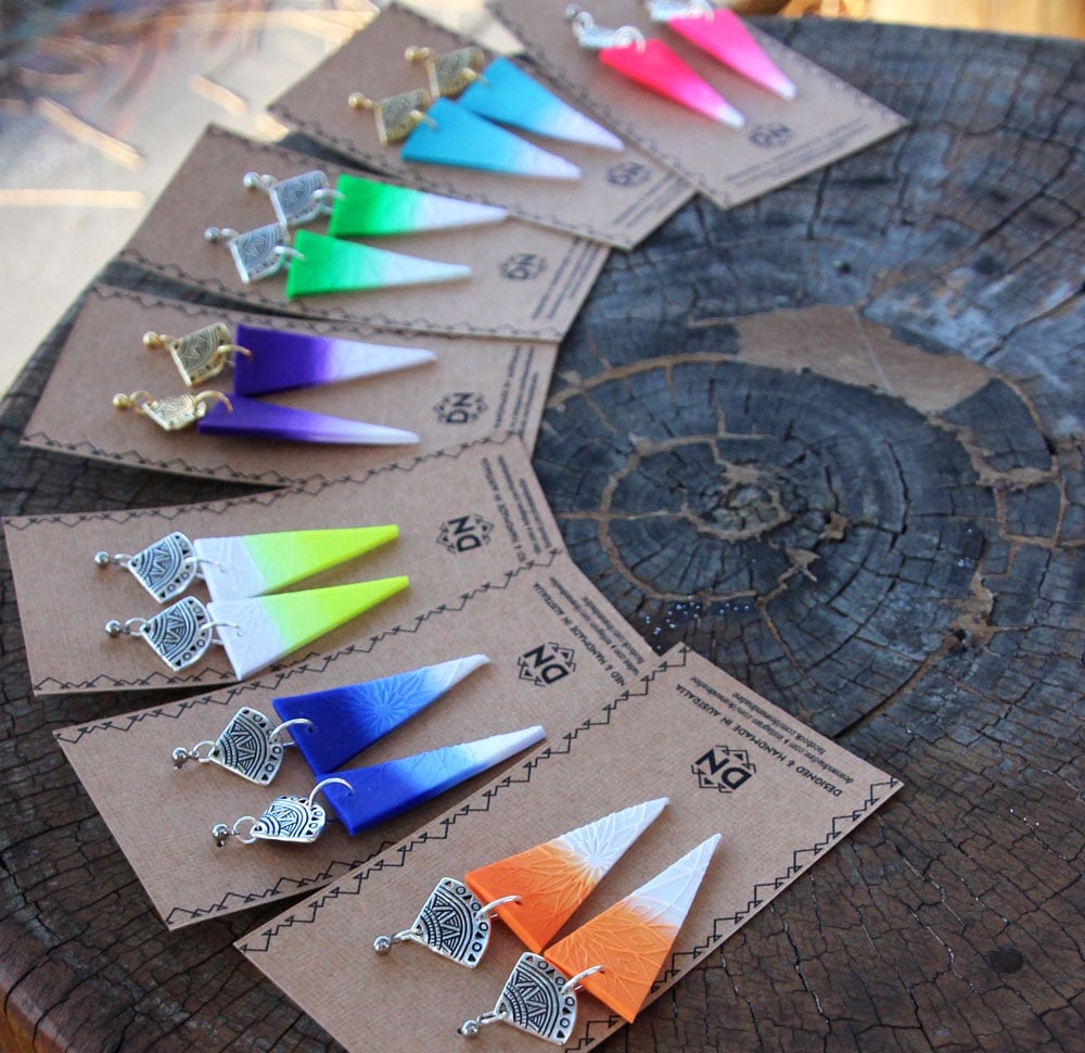 MAKING PROCESS | I used polymer clay to make the long triangles, each colour clay is conditioned. I use a special clay technique to create gradient colour through-out the clay. The clay is cured. I hand drill the pieces and add on the findings to make the finished piece.